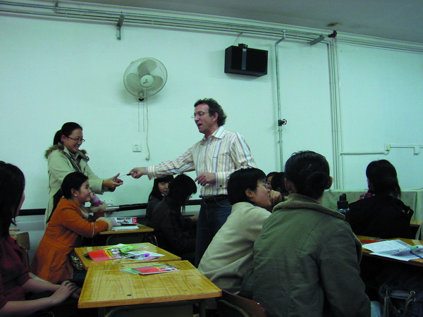 Ian Gordon先生首先进行了自我介绍。随后便对自己所在的国家以及去过的地方进行了一定的描述。从“芝士”讲到“教堂”,最后把重点放在了“婚礼”上。他找了一个女孩和一个男孩上演“求婚”的场景。Ian Gordon为牧师,其它同学则是忠实的证婚人。以矿泉水瓶当鲜花,以粉笔当戒指。这着实让人跌破眼镜。但又不得不佩服Ian Gordon先生丰富的想象力。最后男生以有女朋友为由婉转拒绝了求婚,于是便由Ian Gordon先生亲自求婚。女孩经过Ian Gordon先生的几次追求,最终只得迫于舆论压力“答应”了。台下的证婚人们顿时爆发出一阵阵欢呼声,讲堂气氛十分活跃。最终讲堂以回答问题获取奖品的方式圆满的结束了。大约有10名同学获得了学习英语的书或CD,同学们满载而归。