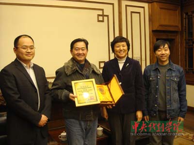 演出开始之前,我院党委副书记、副院长、音乐剧《伪君子》总导演刘立滨与清华大学党委副书记陈旭进行了简短的会面。陈旭副书记代表清华大学对我院师生的进校园演出表示诚挚的感谢;刘立滨副院长感谢清华师生的热情接待,并希望以此为契机,加强两校之间的艺术交流、文化交流。随后,陈旭副书记代表清华大学向刘立滨副院长赠送了感谢证书和纪念品。