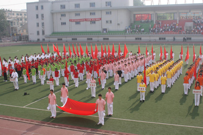 运动会开幕式由徐秀明副院长主持。7点30分,入场式开始,在国旗、校旗、红旗方队的引领下,十支运动员代表队迈着整齐有力的步伐,精神抖擞地通过主席台,接受学院领导的检阅。升旗仪式之前,全体师生为在四川地震中遇难的同胞默哀一分钟。升国旗仪式结束后,院党委书记刘国富宣布本届春季田径运动会开幕。徐翔院长致开幕词。他对学院一年开展本科教学工作水平评估、党建和思想政治工作达标检查、学院学术交流活动等工作进行了简要回顾,对全体同学的一年来的刻苦学习进行了勉励,并希望运动员在比赛中发扬风格,赛出水平。
